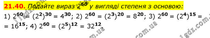 Подайте вираз 260 у вигляді степеня з основою: 1) 260 = (22)30 = 430; 2) 260 = (23)20 = 820; 3) 260 = (24)15 = = 1615; 4) 260 = (25)12 = 3212.