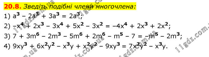 Зведіть подібні члени многочлена: 1) а3 – 2а3 + 3a3 = 2a3; 2) –x4 + 2x3 – 3x4 + 5x2 – 3x2 = –4x4 + 2x3 + 2x2; 3) 7 + 3m6 – 2m3 – 5m6 + 2m6 – m5 – 7 = –m5 – 2m3; 4) 9xy3 + 6x2y2 – x3y + x2y2 – 9xy3 = 7x2y2 – x3y.