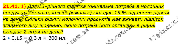 1) Для 13–річного підлітка мінімальна потреба в молочних продуктах (молоко, кефір, ряжанка) складає 15 % від норми рідини на день. Скільки рідких молочних продуктів має вживати підліток згаданого віку щоденно, якщо потреба його організму в рідині складає 2 літри на день? 2 • 0,15 = 0,3 л = 300 мл.