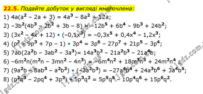 Подайте добуток у вигляді многочлена: 1) 4a(а2 – 2а + 3) = 4a3 – 8а2 + 12а; 2) –3b2(4b3 – 2b2 + 3b – 8) = –12b5 + 6b4 – 9b3 + 24b2; 3) (3х2 – 4х + 12) • (–0,1х3) = –0,3х5 + 0,4х4 – 1,2х3; 4) (р2 – 9р3 + 7p – 1) • 3p4 = 3р6 – 27р7 + 21р5 – 3р4; 5) 7ab(2a2b – 3аb2 – 3а3)= 14а3b2 – 21а2b3 – 21а4b; 6) –6m2n(m2n – 3mn2 – 4n3) = –6m4n2 + 18m3n3 + 24m2n4 ; 7) (9a2b – 8ab3 – а2b2) • (–3а2b3) = –27a4b4 + 24a3b6 + 3a4b5; 8) (p2q3 – 2pq4 + 3р3) • 5p3q2 = 5p5q5 – 10p4q6 + 15p6q2.