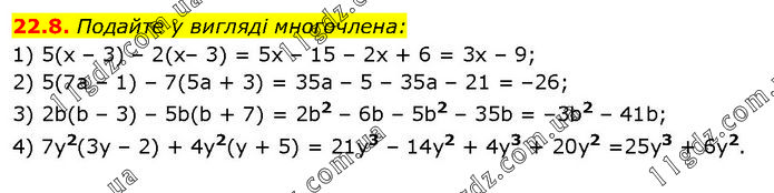 Подайте у вигляді многочлена: 1) 5(x – 3) – 2(х– 3) = 5x – 15 – 2х + 6 = 3х – 9; 2) 5(7а – 1) – 7(5а + 3) = 35а – 5 – 35а – 21 = –26; 3) 2b(b – 3) – 5b(b + 7) = 2b2 – 6b – 5b2 – 35b = –3b2 – 41b; 4) 7у2(3у – 2) + 4у2(у + 5) = 21у3 – 14у2 + 4у3 + 20у2 = 25у3 + 6у2.