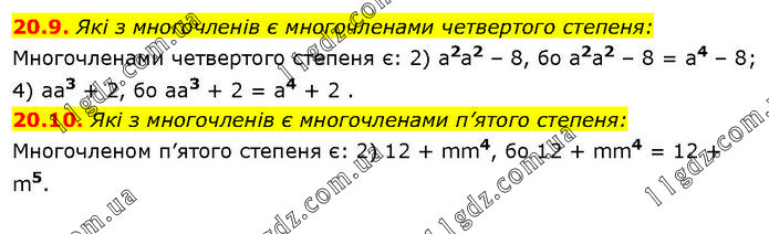 20.9. Які з многочленів є многочленами четвертого степеня: Многочленами четвертого степеня є: 2) a2a2 – 8, бо а2а2 – 8 = а4 – 8; 4) аа3 + 2, бо аа3 + 2 = а4 + 2 . 20.10. Які з многочленів є многочленами п’ятого степеня: Многочленом п’ятого степеня є: 2) 12 + mm4, бо 12 + mm4 = 12 + m5.