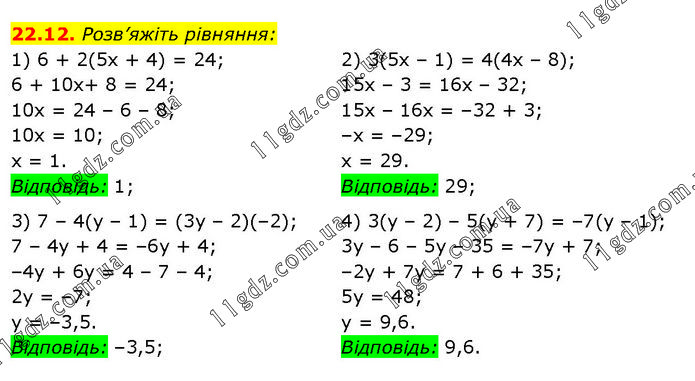 Розв’яжіть рівняння: 1) 6 + 2(5х + 4) = 24; 6 + 10x+ 8 = 24; 10х = 24 – 6 – 8; 10x = 10; х = 1. Відповідь: 1; 2) 3(5х – 1) = 4(4х – 8); 15х – 3 = 16х – 32; 15х – 16х = –32 + 3; –х = –29; х = 29. Відповідь: 29; 3) 7 – 4(у – 1) = (3у – 2)(–2); 7 – 4у + 4 = –6y + 4; –4у + 6у = 4 – 7 – 4; 2у = –7; y = –3,5. Відповідь: –3,5; 4) 3(у – 2) – 5(у + 7) = –7(у – 1); 3y – 6 – 5у – 35 = –7y + 7; –2у + 7y = 7 + 6 + 35; 5y = 48; у = 9,6. Відповідь: 9,6.