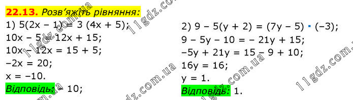 Розв’яжіть рівняння: 1) 5(2x – 1) = 3 (4x + 5); 10x – 5 = 12x + 15; 10x – 12x = 15 + 5; –2x = 20; x = –10. Відповідь: – 10; 2) 9 – 5(y + 2) = (7у – 5) ∙ (–3); 9 – 5y – 10 = – 21y + 15; –5y + 21y = 15 – 9 + 10; 16у = 16; у = 1. Відповідь: 1.