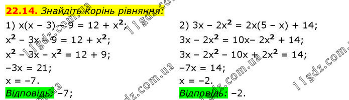 Знайдіть корінь рівняння: 1) x(x – 3) – 9 = 12 + x2; x2 – 3x – 9 = 12 + x2; x2 – 3x – x2 = 12 + 9; –3х = 21; x = –7. Відповідь: –7; 2) 3x – 2x2 = 2x(5 – x) + 14; 3x – 2x2 = 10x– 2x2 + 14; 3x – 2x2 – 10x + 2x2 = 14; –7x = 14; x = –2. Відповідь: –2.