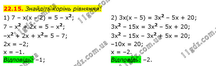 Знайдіть корінь рівняння: 1) 7 – x(x – 2) = 5 – x2; 7 – x2 + 2x = 5 – x2; –x2 + 2x + x2= 5 – 7; 2x = –2; x = –1. Відповідь: –1; 2) 3x(x – 5) = 3x2 – 5x + 20; 3x2 – 15x = 3x2 – 5x + 20; 3x2 – 15x – 3x2 + 5x = 20; –10x = 20; x = –2. Відповідь: –2.