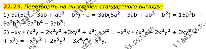 Перетворіть на многочлен стандартного вигляду: 1) 3а(5а2 – 3аb + ab2 – b2) ∙ b = 3аb(5а2 – 3аb + аb3 – b2) = 15а3b – 9а2b2 + 3a2b4 – 3аb3; 2) –ху ∙ (х2у – 2х2у2 + 3ху3 + х3) ∙ x2 = –х3у ∙ (х2у – 2х2у2 + 3ху3 + + x3) = –х5у2 + 2х5y3 – 3х4у4 – х6у.