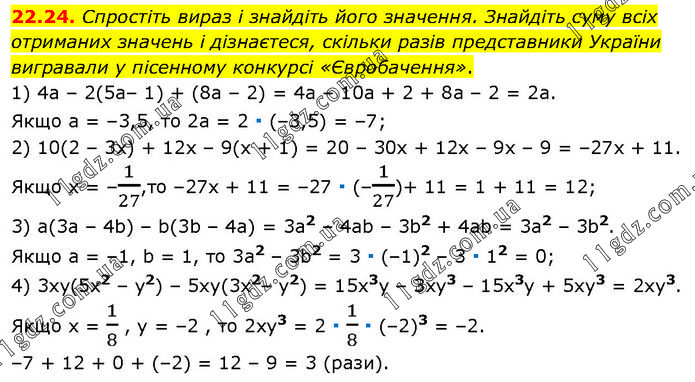 Спростіть вираз і знайдіть його значення. Знайдіть суму всіх отриманих значень і дізнаєтеся, скільки разів представники України вигравали у пісенному конкурсі «Євробачення». 1) 4a – 2(5a– 1) + (8a – 2) = 4a – 10a + 2 + 8a – 2 = 2a. Якщо a = –3,5, то 2а = 2 ∙ (–3,5) = –7; 2) 10(2 – 3x) + 12x – 9(x + 1) = 20 – 30x + 12x – 9x – 9 = –27x + 11. Якщо x = –1/27,то –27x + 11 = –27 ∙ (–1/27)+ 11 = 1 + 11 = 12; 3) а(3а – 4b) – b(3b – 4а) = 3а2 – 4ab – 3b2 + 4аb = 3а2 – 3b2. Якщо a = –1, b = 1, то 3a2 – 3b2 = 3 ∙ (–1)2 – 3 ∙ 12 = 0; 4) 3ху(5х2 – у2) – 5ху(3х2– у2) = 15х3у – 3ху3 – 15x3у + 5xy3 = 2xy3. Якщо х = 1/8 , у = –2 , то 2xy3 = 2 ∙ 1/8 ∙ (–2)3 = –2. –7 + 12 + 0 + (–2) = 12 – 9 = 3 (рази).