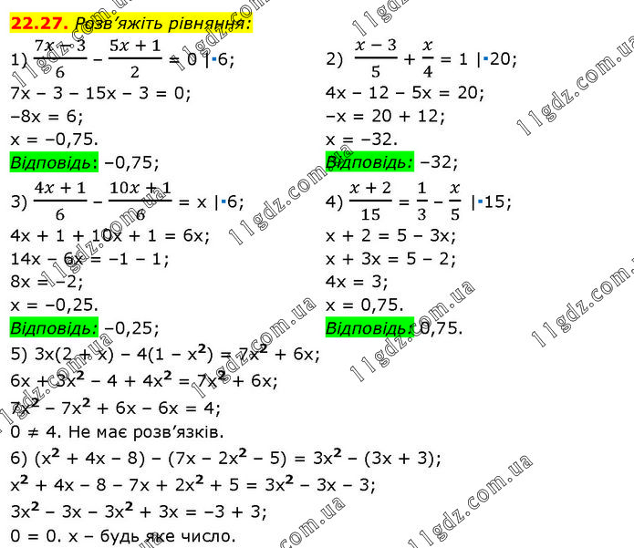 Розв’яжіть рівняння: 1) (7x - 3)/6 – (5x + 1)/2 = 0 |∙6; 7х – 3 – 15х – 3 = 0; –8х = 6; х = –0,75. Відповідь: –0,75; 2) (x - 3)/5 + x/4 = 1 |∙20; 4х – 12 – 5х = 20; –х = 20 + 12; х = –32. Відповідь: –32; 3) (4x + 1)/6 – (10x + 1)/6 = x |∙6; 4х + 1 + 10x + 1 = 6х; 14х – 6х = –1 – 1; 8х = –2; х = –0,25. Відповідь: –0,25; 4) (x + 2)/15 = 1/3 – x/5 |∙15; х + 2 = 5 – 3х; х + 3х = 5 – 2; 4х = 3; х = 0,75. Відповідь: 0,75. 5) 3х(2 + х) – 4(1 – х2) = 7х2 + 6х; 6х + 3х2 – 4 + 4х2 = 7х2 + 6х; 7х2 – 7х2 + 6х – 6х = 4; 0 ≠ 4. Не має розв’язків. 6) (х2 + 4х – 8) – (7х – 2х2 – 5) = 3х2 – (3х + 3); х2 + 4х – 8 – 7х + 2х2 + 5 = 3х2 – 3х – 3; 3х2 – 3х – 3х2 + 3х = –3 + 3; 0 = 0. х – будь яке число.