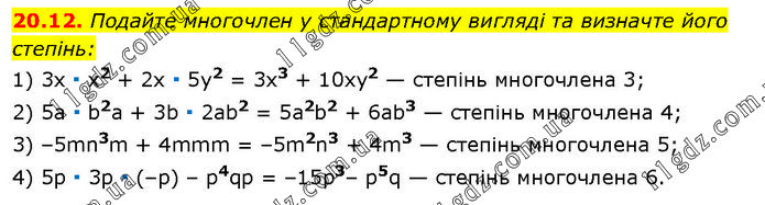 20.12. Подайте многочлен у стандартному вигляді та визначте його степінь: 1) 3х ∙ x2 + 2х ∙ 5y2 = 3х3 + 10xy2 — степінь многочлена 3; 2) 5а ∙ b2а + 3b ∙ 2ab2 = 5а2b2 + 6аb3 — степінь многочлена 4; 3) –5mn3m + 4mmm = –5m2n3 + 4m3 — степінь многочлена 5; 4) 5р ∙ 3р ∙ (–р) – p4qp = –15p3– p5q — степінь многочлена 6.