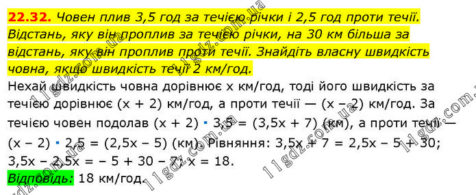 Човен плив 3,5 год за течією річки і 2,5 год проти течії. Відстань, яку він проплив за течією річки, на 30 км більша за відстань, яку він проплив проти течії. Знайдіть власну швидкість човна, якщо швидкість течії 2 км/год. Нехай швидкість човна дорівнює х км/год, тоді його швидкість за течією дорівнює (х + 2) км/год, а проти течії — (х – 2) км/год. За течією човен подолав (х + 2) ∙ 3,5 = (3,5х + 7) (км), а проти течії — (х – 2) ∙ 2,5 = (2,5х – 5) (км). Рівняння: 3,5х + 7 = 2,5х – 5 + 30; 3,5х – 2,5х = – 5 + 30 – 7; х = 18. Відповідь: 18 км/год.