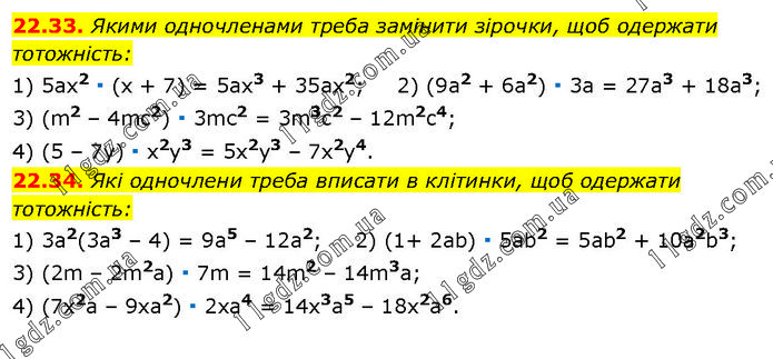 22.33. Якими одночленами треба замінити зірочки, щоб одержати тотожність: 1) 5ax2 ∙ (х + 7) = 5ax3 + 35ах2; 2) (9а2 + 6а2) ∙ 3а = 27а3 + 18а3; 3) (m2 – 4mc2) ∙ 3mс2 = 3m3c2 – 12m2c4; 4) (5 – 7у) ∙ х2y3 = 5х2y3 – 7х2y4. 22.34. Які одночлени треба вписати в клітинки, щоб одержати тотожність: 1) 3a2(3a3 – 4) = 9а5 – 12а2; 2) (1+ 2ab) ∙ 5ab2 = 5ab2 + 10а2b3; 3) (2m – 2m2а) ∙ 7m = 14m2 – 14m3а; 4) (7x2а – 9ха2) ∙ 2ха4 = 14х3а5 – 18x2a6.