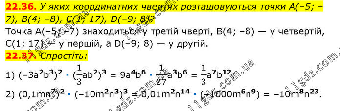 22.36. У яких координатних чвертях розташовуються точки А(–5; –7), B(4; –8), С(1; 17), D(–9; 8)? Точка A(–5; –7) знаходиться у третій чверті, B(4; –8) — у четвертій, С(1; 17) — у першій, a D(–9; 8) — у другій. 22.37. Спростіть: 1) (–3а2b3)2 ∙ (1/3ab2)3 = 9a4b6 ∙ 1/27a3b6 = 1/3a7b12; 2) (0,1mn7)2 ∙ (–10m2n3)3 = 0,01m2n14 ∙ (–1000m6n9) = –10m8n23.