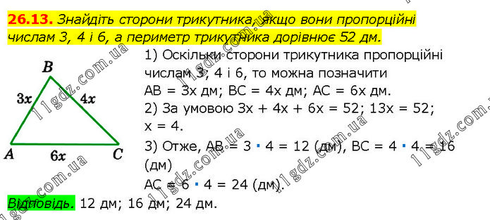 Знайдіть сторони трикутника, якщо вони пропорційні числам 3, 4 і 6, а периметр трикутника дорівнює 52 дм. 1) Оскільки сторони трикутника пропорційні числам 3; 4 і 6, то можна позначити AB = Зх дм; BC = 4х дм; AC = 6х дм. 2) За умовою Зх + 4х + 6х = 52; 13х = 52; х = 4. 3) Отже, AB = 3 ∙ 4 = 12 (дм), BC = 4 ∙ 4 = 16 (дм) АС = 6 ∙ 4 = 24 (дм). Відповідь. 12 дм; 16 дм; 24 дм.