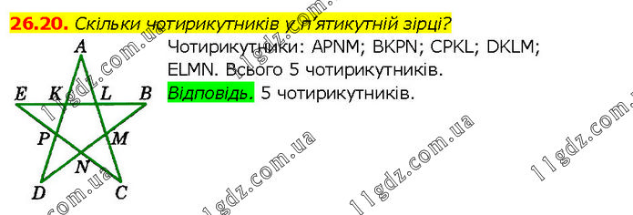 Скільки чотирикутників у п’ятикутній зірці? Чотирикутники: APNM; BKPN; CPKL; DKLM; ELMN. Всього 5 чотирикутників. Відповідь. 5 чотирикутників.