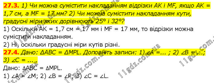 27.3. 1) Чи можна сумістити накладанням відрізки AK і MF, якщо AK = 1,7 см, a MF = 17 мм? 2) Чи можна сумістити накладанням кути, градусні міри яких дорівнюють 25° і 32°? 1) Оскільки AK = 1,7 см = 17 мм і MF = 17 мм, то відрізки можна сумістити накладанням. 2) Ні, оскільки градусні міри кутів різні. 27.4. Дано: ΔABC = ΔMPL. Доповніть записи: 1) ∠A =... ; 2) ∠B = ...; 3) ∠C = ... . Дано: ∆ABC = ∆MPL. 1) ∠A = ∠M; 2) ∠B = ∠Р; 3) ∠C = ∠L.