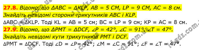 27.8. Відомо, що ΔABC = ΔKLP, AB = 5 CM, LP = 9 CM, AC = 8 см. Знайдіть невідомі сторони трикутників ABC і KLP. ∆ABC = ∆KLP. Тоді KL = AB = 5 см; BC = LP = 9 см; KP = AC = 8 см. 27.9. Відомо, що ΔPMT = ΔDCF, ∠P = 42°, ∠C = 91°, ∠T = 47°. Знайдіть невідомі кути трикутників PMT і DCF. ∆PMT = ∆DCF. Тоді ∠D = ∠P= 42°; ∠M = ∠C = 91°; ∠F = ∠T = 47°.