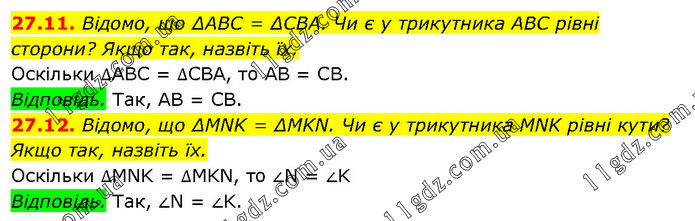 27.11. Відомо, що ΔABC = ΔCBA. Чи є у трикутника ABC рівні сторони? Якщо так, назвіть їх. Оскільки ∆ABC = ∆CBA, то AB = CB. Відповідь. Так, AB = CB. 27.12. Відомо, що ΔMNK = ΔMKN. Чи є у трикутника MNK рівні кути? Якщо так, назвіть їх. Оскільки ∆MNK = ∆MKN, то ∠N = ∠K Відповідь. Так, ∠N = ∠K.