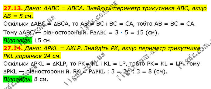 27.13. Дано: ΔABC = ΔBCA. Знайдіть периметр трикутника ABC, якщо AB = 5 см. Оскільки ∆ABC = ∆BCA, то AB = BC і BC = CA, тобто AB = BC = CA. Тому ∆ABC — рівносторонній. P∆АВС = 3 ∙ 5 = 15 (см). Відповідь. 15 см. 27.14. Дано: ΔPKL = ΔKLP. Знайдіть PK, якщо периметр трикутника PKL дорівнює 24 см. Оскільки ∆PKL = ∆KLP, то PK= KL і KL = LP, тобто PK= KL = LP. Тому ∆PKL — рівносторонній. PK = P∆PKL : 3 = 24 : 3 = 8 (см). Відповідь. 8 см.