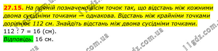 27.15. На прямій позначено вісім точок так, що відстань між кожними двома сусідніми точками — однакова. Відстань між крайніми точками дорівнює 112 см. Знайдіть відстань між двома сусідніми точками. 112 : 7 = 16 (см). Відповідь. 16 см.