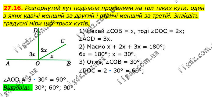 Розгорнутий кут поділили променями на три таких кути, один з яких удвічі менший за другий і втричі менший за третій. Знайдіть градусні міри цих трьох кутів. 1) Нехай ∠COB = х, тоді ∠DOC = 2х; ∠AOD = Зх. 2) Маємо х + 2х + Зх = 180°; 6х = 180°; х = 30°. 3) Отже, ∠COB = 30°; ∠DOC = 2 ∙ 30° = 60°; ∠AOD = 3 ∙ 30° = 90°. Відповідь. 30°; 60°; 90°.