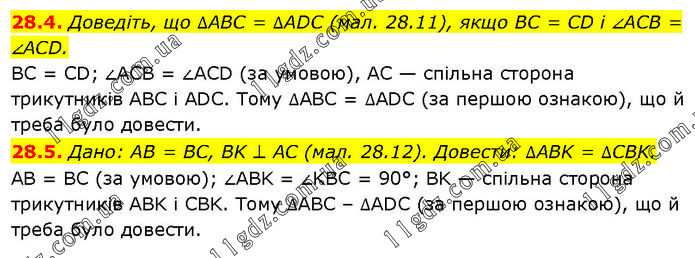 28.4. Доведіть, що ∆ABC = ∆ADC (мал. 28.11), якщо BC = CD і ∠ACB = ∠ACD. BC = CD; ∠ACB = ∠ACD (за умовою), AC — спільна сторона трикутників ABC і ADC. Тому ∆ABC = ∆ADC (за першою ознакою), що й треба було довести. 28.5. Дано: AB = BC, BK ⊥ AC (мал. 28.12). Довести: ∆ABK = ∆CBK. AB = BC (за умовою); ∠ABK = ∠KBC = 90°; BK — спільна сторона трикутників ABK і CBK. Тому ∆ABC – ∆ADC (за першою ознакою), що й треба було довести.