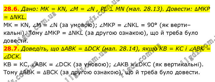28.6. Дано: MK = KN, ∠M = ∠N , PL ⊥ MN (мал. 28.13). Довести: ∆MKP = ∆NKL. MK = KN, ∠M = ∠N (за умовою); ∠MKP = ∠NKL = 90° (як верти–кальні). Тому ∆MKP = ∆NKL (за другою ознакою), що й треба було довести. 28.7. Доведіть, що ∆ABK = ∆DCK (мал. 28.14), якщо KB = KC і ∠ABK = ∠DCK. KB = KC, ∠ABK = ∠DCK (за умовою); ∠AKB =∠DKC (як вертикальні). Тому ∆ABK = ∆BCK (за другою ознакою), що й треба було довести.