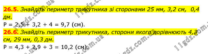 26.5. Знайдіть периметр трикутника зі сторонами 25 мм, 3,2 см, 0,4 дм. P = 2,5 + 3,2 + 4 = 9,7 (см). 26.6. Знайдіть периметр трикутника, сторони якого дорівнюють 4,3 см, 29 мм, 0,3 дм. P = 4,3 + 2,9 + 3 = 10,2 (см).