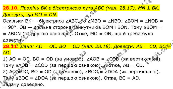 28.10. Промінь BK є бісектрисою кута ABC (мал. 28.17), MN ⊥ BK. Доведіть, що MO = ON. Оскільки BK — бісектриса ∠ABC, то ∠MBO = ∠NBO; ∠BOM = ∠NOB = = 90°. OB — спільна сторона трикутників BOM і BON. Тому ∆BOM = = ∆BON (за другою ознакою). Отже, MO = ON, що й треба було довести. 28.11. Дано: AO = ОС, BO = OD (мал. 28.18). Довести: AB = CD, BC = AD. 1) AO = OC, BO = OD (за умовою), ∠AOB = ∠COD (як вертикальні). Тому ∆AOB = ∆COD (за першою ознакою). А отже, AB = CD. 2) AO =OC, BO = OD (за умовою), ∠BOC = ∠DOA (як вертикальні). Тому ∆BOC = ∆DOA (за першою ознакою). Отже, BC = AD. Задачу доведено.