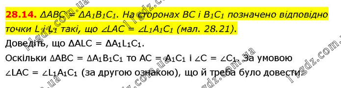 ΔABC = ΔA1B1C1. На сторонах BC і B1C1 позначено відповідно точки L і L1 такі, що ∠LAC = ∠L1A1C1 (мал. 28.21). Доведіть, що ΔALC = ΔA1L1C1. Оскільки ∆ABC = ∆A1B1C1 то AC = A1C1 і ∠C = ∠C1. За умовою ∠LAC = ∠L1A1C1 (за другою ознакою), що й треба було довести.
