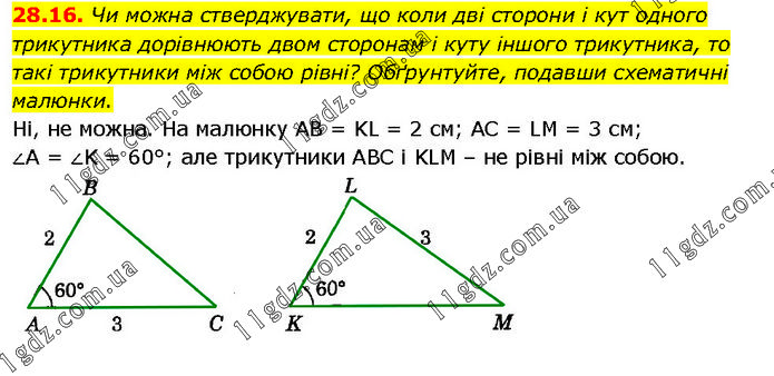 Чи можна стверджувати, що коли дві сторони і кут одного трикутника дорівнюють двом сторонам і куту іншого трикутника, то такі трикутники між собою рівні? Обґрунтуйте, подавши схематичні малюнки. Ні, не можна. На малюнку AB = KL = 2 см; AC = LM = 3 см; ∠A = ∠K = 60°; але трикутники ABC і KLM – не рівні між собою.