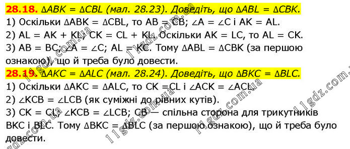 28.18. ∆ABK = ∆CBL (мал. 28.23). Доведіть, що ∆ABL = ∆CBK. 1) Оскільки ∆ABK = ∆CBL, то AB = CB; ∠A = ∠C i AK = AL. 2) AL = AK + KL; CK = CL + KL. Оскільки AK = LC, то AL = CK. 3) AB = BC; ∠A = ∠C; AL = KC. Тому ∆ABL = ∆CBK (за першою ознакою), що й треба було довести. 28.19. ∆AKC = ∆ALC (мал. 28.24). Доведіть, що ∆BKC = ∆BLC. 1) Оскільки ∆AKC = ∆ALC, то CK =CL i ∠ACK = ∠ACL. 2) ∠KCB = ∠LCB (як суміжні до рівних кутів). 3) CK = CL; ∠KCB = ∠LCB; CB — спільна сторона для трикутників BKC і BLC. Тому ∆BKC = ∆BLC (за першою ознакою), що й треба було довести.