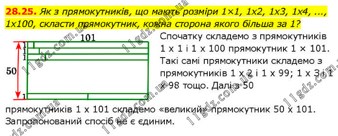 Як з прямокутників, що мають розміри 1×1, 1x2, 1x3, 1x4, ..., 1x100, скласти прямокутник, кожна сторона якого більша за 1? Спочатку складемо з прямокутників 1 x 1 i 1 x 100 прямокутник 1 × 101. Такі самі прямокутники складемо з прямокутників 1 х 2 і 1 х 99; 1 х З і 1 х 98 тощо. Далі з 50 прямокутників 1 х 101 складемо «великий» прямокутник 50 х 101. Запропонований спосіб не є єдиним.