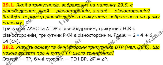 29.1. Який з трикутників, зображених на малюнку 29.5, є рівнобедреним, який — рівностороннім, а який — різностороннім? Знайдіть периметр рівнобедреного трикутника, зображеного на цьому малюнку. Трикутник ∆ABC та ∆TDP є рівнобедреним, трикутник FCK є рівностороннім, трикутник PKM є різностороннім. P∆ABC = 2 ∙ 4 + 6 = 14 (см). 29.2. Укажіть основу та бічні сторони трикутника DTP (мал. 29.6). Що можна сказати про А кути T i P цього трикутника? Основа — TP, бічні сторони — TD і DP. ∠T = ∠P.
