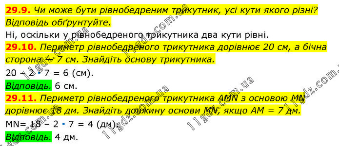 29.9. Чи може бути рівнобедреним трикутник, усі кути якого різні? Відповідь обґрунтуйте. Hi, оскільки у рівнобедреного трикутника два кути рівні. 29.10. Периметр рівнобедреного трикутника дорівнює 20 см, а бічна сторона — 7 см. Знайдіть основу трикутника. 20 – 2 ∙ 7 = 6 (см). Відповідь. 6 см. 29.11. Периметр рівнобедреного трикутника AMN з основою MN дорівнює 18 дм. Знайдіть довжину основи MN, якщо AM = 7 дм. MN= 18 – 2 ∙ 7 = 4 (дм). Відповідь. 4 дм.