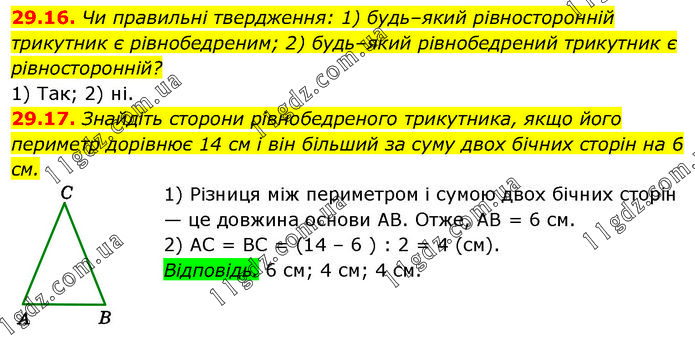 29.16. Чи правильні твердження: 1) будь–який рівносторонній трикутник є рівнобедреним; 2) будь–який рівнобедрений трикутник є рівносторонній? 1) Так; 2) ні. 29.17. Знайдіть сторони рівнобедреного трикутника, якщо його периметр дорівнює 14 см і він більший за суму двох бічних сторін на 6 см. 1) Різниця між периметром і сумою двох бічних сторін — це довжина основи AB. Отже, AB = 6 см. 2) AC = BC = (14 – 6 ) : 2 = 4 (см). Відповідь. 6 см; 4 см; 4 см.