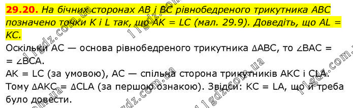 На бічних сторонах AB і BC рівнобедреного трикутника ABC позначено точки K і L так, що AK = LC (мал. 29.9). Доведіть, що AL = KC. Оскільки AC — основа рівнобедреного трикутника ∆ABC, то ∠BAC = = ∠BCA. AK = LC (за умовою), AC — спільна сторона трикутників AKC і CLA. Тому ∆AKC = ∆CLA (за першою ознакою). Звідси: KC = LA, що й треба було довести.