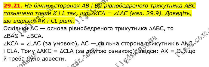 На бічних сторонах AB і BC рівнобедреного трикутника ABC позначено точки K і L так, що ∠KCA = ∠LAC (мал. 29.9). Доведіть, що відрізки AK і CL рівні. Оскільки AC — основа рівнобедреного трикутника ∆ABC, то ∠BAC = ∠BCA. ∠KCA = ∠LAC (за умовою), AC — спільна сторона трикутників AKC і CLA. Тому ∆AKC = ∆CLA (за другою ознакою), звідси: AK = CL, що й треба було довести.
