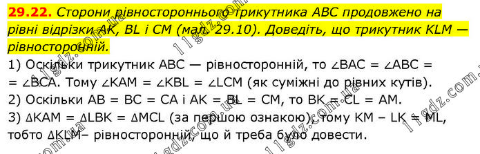 Сторони рівностороннього трикутника ABC продовжено на рівні відрізки AK, BL і CM (мал. 29.10). Доведіть, що трикутник KLM — рівносторонній. 1) Оскільки трикутник ABC — рівносторонній, то ∠BAC = ∠ABC = = ∠BCA. Тому ∠KAM = ∠KBL = ∠LCM (як суміжні до рівних кутів). 2) Оскільки AB = BC = CA і AK = BL = CM, то BK = CL = AM. 3) ∆KAM = ∆LBK = ∆MCL (за першою ознакою), тому KM – LK = ML, тобто ∆KLM– рівносторонній, що й треба було довести.