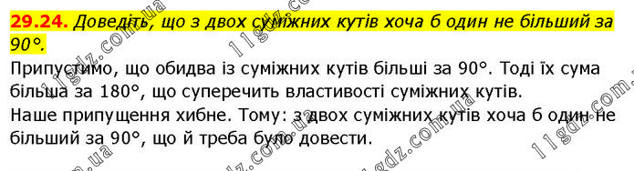 Доведіть, що з двох суміжних кутів хоча б один не більший за 90°. Припустимо, що обидва із суміжних кутів більші за 90°. Тоді їх сума більша за 180°, що суперечить властивості суміжних кутів. Наше припущення хибне. Тому: з двох суміжних кутів хоча б один не більший за 90°, що й треба було довести.