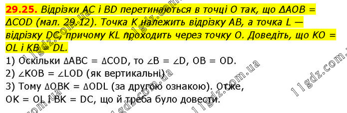 Відрізки AC і BD перетинаються в точці O так, що ΔAOB = ΔCOD (мал. 29.12). Точка K належить відрізку AB, а точка L — відрізку DC, причому KL проходить через точку О. Доведіть, що KO = OL і KB = DL. 1) Оскільки ∆ABC = ∆COD, то ∠B = ∠D, OB = OD. 2) ∠KOB = ∠LOD (як вертикальні) 3) Тому ∆OBK = ∆ODL (за другою ознакою). Отже, OK = OL і BK = DC, що й треба було довести.