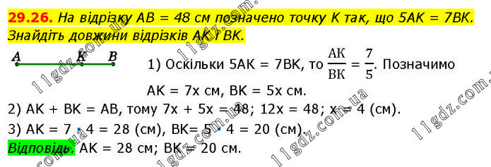 На відрізку AB = 48 см позначено точку K так, що 5AK = 7ВК. Знайдіть довжини відрізків AK і BK. 1) Оскільки 5АК = 7BK, то АК/ВК = 7/5. Позначимо AK = 7x см, BK = 5х см. 2) AK + BK = AB, тому 7х + 5х = 48; 12х = 48; х = 4 (см). 3) AK = 7 ∙ 4 = 28 (см), BK= 5 ∙ 4 = 20 (см). Відповідь. AK = 28 см; BK = 20 см.