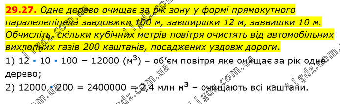 Одне дерево очищає за рік зону у формі прямокутного паралелепіпеда завдовжки 100 м, завширшки 12 м, заввишки 10 м. Обчисліть, скільки кубічних метрів повітря очистять від автомобільних вихлопних газів 200 каштанів, посаджених уздовж дороги. 1) 12 ∙ 10 ∙ 100 = 12000 (м3) – об’єм повітря яке очищає за рік одне дерево; 2) 12000 ∙ 200 = 2400000 = 2,4 млн м3 – очищають всі каштани.