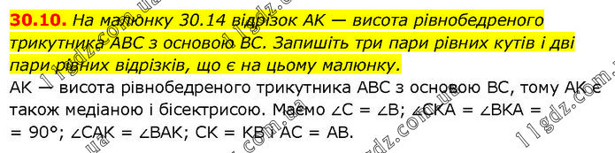 На малюнку 30.14 відрізок AK — висота рівнобедреного трикутника ABC з основою BC. Запишіть три пари рівних кутів і дві пари рівних відрізків, що є на цьому малюнку. AK — висота рівнобедреного трикутника ABC з основою BC, тому AK є також медіаною і бісектрисою. Маємо ∠C = ∠B; ∠CKA = ∠BKA = = 90°; ∠CAK = ∠BAK; CK = KB і AC = AB.