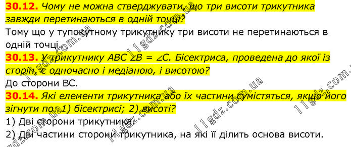 30.12. Чому не можна стверджувати, що три висоти трикутника завжди перетинаються в одній точці? Тому що у тупокутному трикутнику три висоти не перетинаються в одній точці. 30.13. У трикутнику ABC ∠B = ∠C. Бісектриса, проведена до якої із сторін, є одночасно і медіаною, і висотою? До сторони BC. 30.14. Які елементи трикутника або їх частини сумістяться, якщо його зігнути по: 1) бісектрисі; 2) висоті? 1) Дві сторони трикутника. 2) Дві частини сторони трикутника, на які її ділить основа висоти.