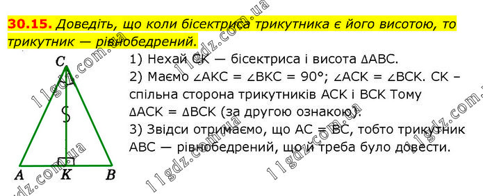 Доведіть, що коли бісектриса трикутника є його висотою, то трикутник — рівнобедрений. 1) Нехай CK — бісектриса і висота ∆ABC. 2) Маємо ∠AKC = ∠BKC = 90°; ∠ACK = ∠BCK. CK – спільна сторона трикутників ACK і BCK Тому ∆ACK = ∆BCK (за другою ознакою). 3) Звідси отримаємо, що AC = BC, тобто трикутник ABC — рівнобедрений, що й треба було довести.