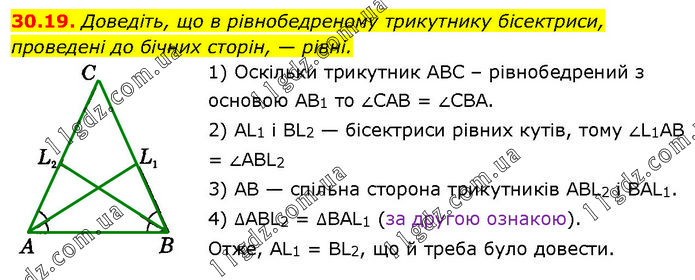 Доведіть, що в рівнобедреному трикутнику бісектриси, проведені до бічних сторін, — рівні. 1) Оскільки трикутник ABC – рівнобедрений з основою AB1 то ∠CAB = ∠CBA. 2) AL1 і BL2 — бісектриси рівних кутів, тому ∠L1AB = ∠ABL2 3) AB — спільна сторона трикутників ABL2 і BAL1. 4) ∆ABL2 = ∆BAL1 (за другою ознакою). Отже, AL1 = BL2, що й треба було довести.