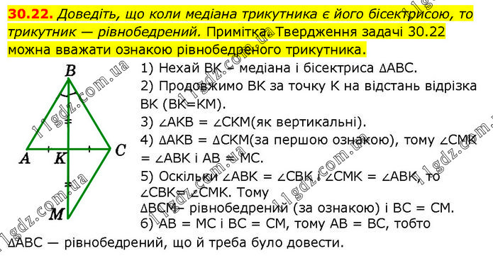 Доведіть, що коли медіана трикутника є його бісектрисою, то трикутник — рівнобедрений. Примітка. Твердження задачі 30.22 можна вважати ознакою рівнобедреного трикутника. 1) Нехай BK – медіана і бісектриса ∆ABC. 2) Продовжимо BK за точку K на відстань відрізка BK (BK=KM). 3) ∠AKB = ∠CKM(як вертикальні). 4) ∆AKB = ∆CKM(за першою ознакою), тому ∠CMK = ∠ABK i AB = MC. 5) Оскільки ∠ABK = ∠CBK i ∠CMK = ∠ABK, то ∠CBK= ∠CMK. Тому ∆BCM– рівнобедрений (за ознакою) і BC = CM. 6) AB = MC і BC = СМ, тому AB = BC, тобто ∆ABC — рівнобедрений, що й треба було довести.