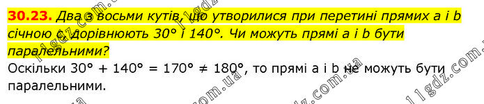 Два з восьми кутів, що утворилися при перетині прямих а і b січною с, дорівнюють 30° і 140°. Чи можуть прямі а і b бути паралельними? Оскільки 30° + 140° = 170° ≠ 180°, то прямі а і b не можуть бути паралельними.