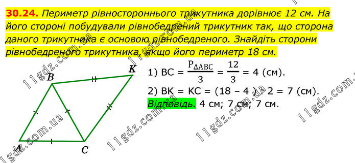 Периметр рівностороннього трикутника дорівнює 12 см. На його стороні побудували рівнобедрений трикутник так, що сторона даного трикутника є основою рівнобедреного. Знайдіть сторони рівнобедреного трикутника, якщо його периметр 18 см. 1) BC = Р_∆АВС/3 = 12/3 = 4 (см). 2) BK = KC = (18 – 4 ) : 2 = 7 (см). Відповідь. 4 см; 7 см; 7 см.